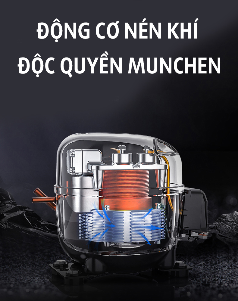Động cơ khí nén hiện đại công nghệ độc quyền Munchen trang bị trên các mẫu tủ rượu vang của hãng mang đến khả năng vận hành êm ái, nhiệt độ ổn định gấp 4 lần so với máy nén thông thường. Tiết kiệm điện năng nhưng vẫn đảm bảo khả năng làm lạnh tối ưu nhất.