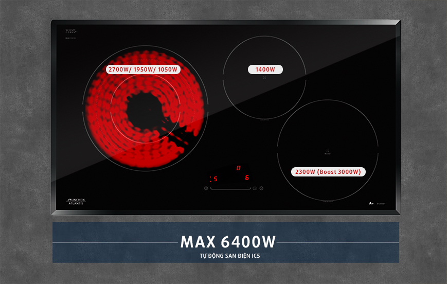 Bếp được trang bị 3 vùng nấu hỗn hợp có mức công suất lần lượt là: vùng nấu hồng ngoại 3 vòng nhiệt (2700W/ 1950W/ 1050W), vùng nấu bên phải 2300 W (Booster 3000W), vùng nấu giữa 1400W. Tuy nhiên do sử dụng bộ san điện IC5 ( một đặc trưng của dòng bếp Munchen) nên khi bạn sử dụng đồng thời cả 3 vùng nấu thì tổng công suất của bếp chỉ đạt được max 6400W, đảm bảo độ ổn định và an toàn cho hệ thống điện, tránh hiện tượng quá tải, nhảy áp.