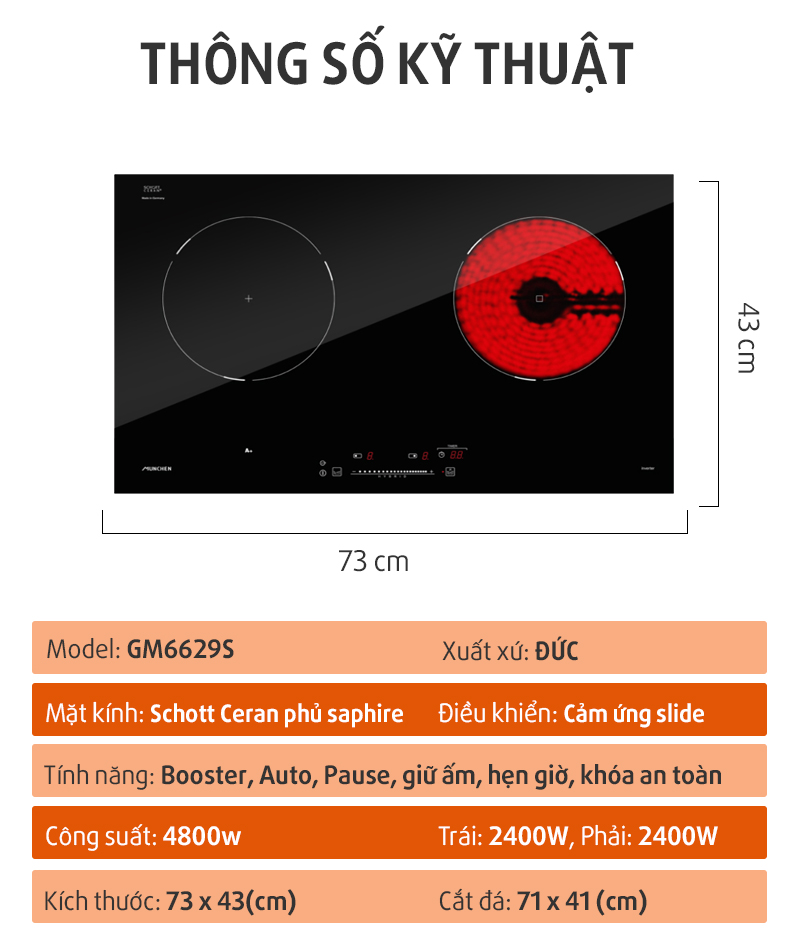 Ngoài ra chính việc thiết kế kếp hợp giữa một vùng nấu cảm ứng và một vúng nấu hồng ngoại làm cho khả năng tiện dụng của mẫu bếp điện từ Munchen GM6629S được đánh giá rất cao, khi mà người nội trợ vừa có thể đun nấu nhanh của bếp từ, vừa có thể đun nấu được mọi loại xong nồi với bếp hồng ngoại.