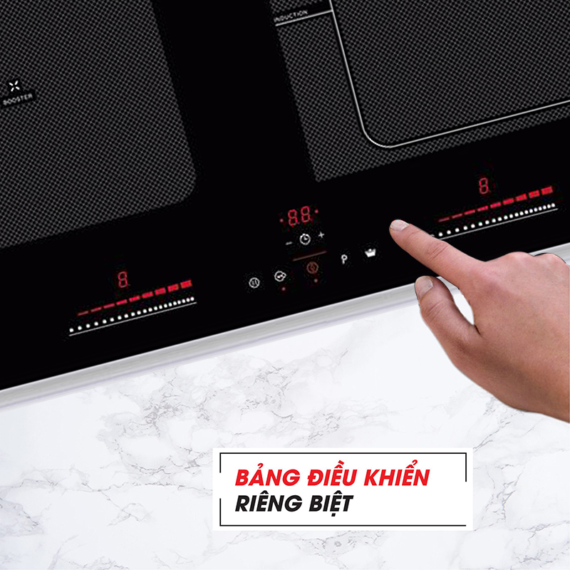 Với bảng điều khiển cảm ứng tách riêng cho mỗi vùng nấu, giúp người dùng dễ quan sát và thao tác, các phím cảm ứng và thanh trượt cảm ứng tăng giảm công suất mang lại sự mượt mà, với độ trễ cực thấp (0.02s), kết hợp với các led màu đỏ rất rõ nét và cực kỳ trực quan cho mỗi phím chức năng trên bảng điều khiển cảu bếp.