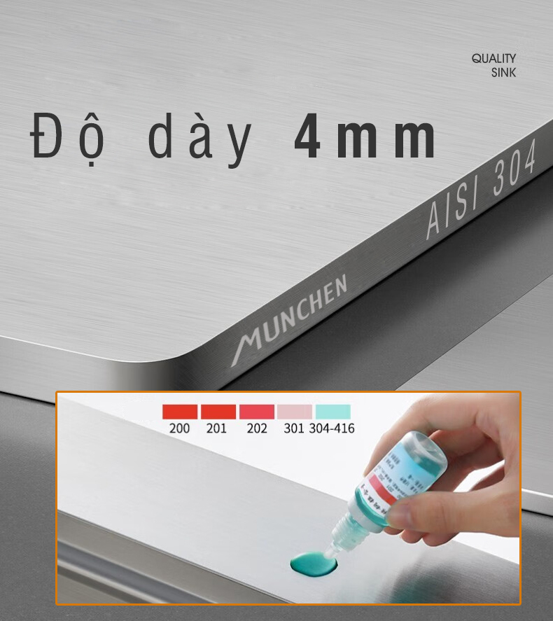 Đối với sản phẩm chậu rửa bát 2 hố, Munchen sử dụng Inox 304 đạt các tiêu chuẩn quốc tế AISI 304. Chất liệu này mang lại những đặc tính tuyệt vời cho sản phẩm như khả năng chống chịu sự oxy hóa cao và bền đẹp sau thời gian dài sử dụng. Đặc biệt độ dày của các thành chậu lên đến 4mm càng tạo thêm sự chắc chắn và bền bỉ cho sản phẩm.