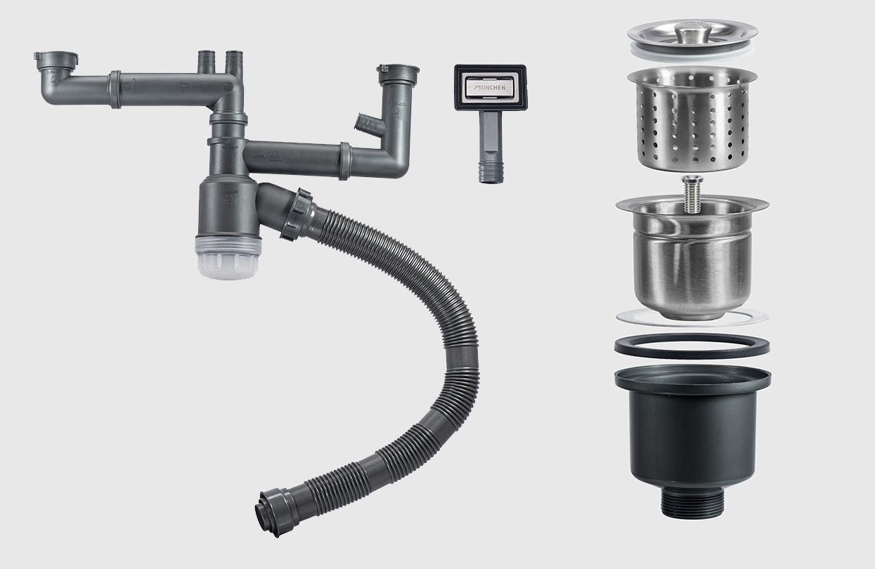 Những phụ kiện đi kèm theo chậu rửa bát 2 hố Munchen có độ bền cực kỳ cao và mang lại tính đa dụng cao khi sử dụng. Sau 1 thời gian dài sử dụng, bộ xả thường sẽ gặp các vấn đề như rò rỉ nước hay tắc nghẽn. Vì vậy, để giúp bạn lựa chọn chậu rửa bát có bộ xả tốt, Munchen nghiên cứu và phát triển bộ xả thải độc quyền giúp giải quyết những phiền toái ấy: