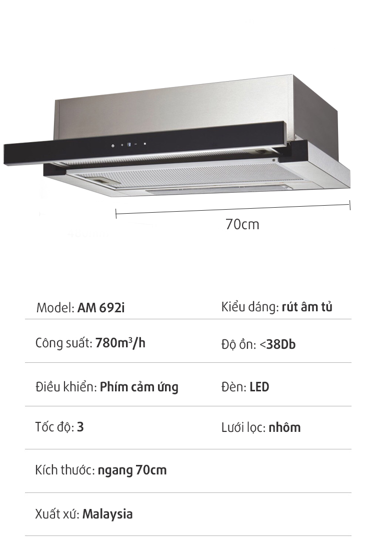 Máy hút mùi Munchen AM692i là mẫu hút mùi mới nhất của hãng Munchen được thiết kế theo kiểu dáng âm tủ sang trọng, mang lại sự hiện đại và thực sự nổi bật cho không gian được sở hữu. Chưa hết với bề mặt hút có thể rút ra khi sử dụng và đẩy vào khi không sử dụng sẽ giúp bạn tiết kiệm không gian sử dụng rất thích hợp cho nhà bếp có diện tích nhỏ.