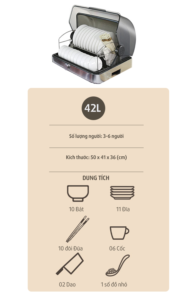 Với thông số kích thước này, chúng ta dễ dàng nhận thấy được sự nhỏ gọn trong thiết kế của chiếc máy sấy bát munchen này. Bạn có thể để máy trên bàn bếp, hoặc một không gian không cần quá lớn trong nhà bếp, có thể phù hợp cho mọi gia đình có từ 6 thành viên trở xuống.