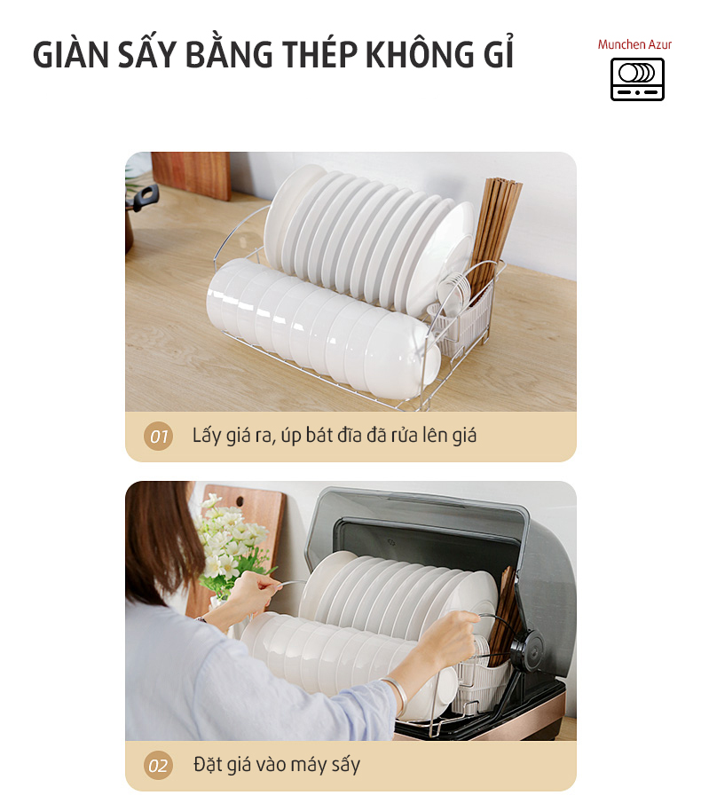 Giàn sấy của máy sấy bát Munchen Azur được làm bằng thép không gỉ, có thể dễ dàng tháo dỡ khỏi máy và lắp đặt lại máy rất tiện dụng.
