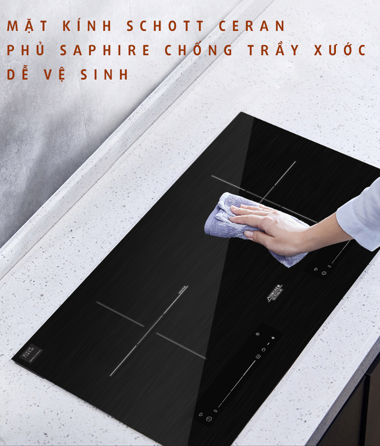Bếp từ Munchen GM2266SA trang bị mặt kính Schott Ceran được phủ Saphire dạng vân xước, tạp ra sự nổi bật và sang trọng cho chiếc bếp. Bề mặt này có khả năng chống trầy, xước rất cao, đặc biệt rất dễ lau, chùi, vệ sinh sau khi sử dụng hàng ngày.