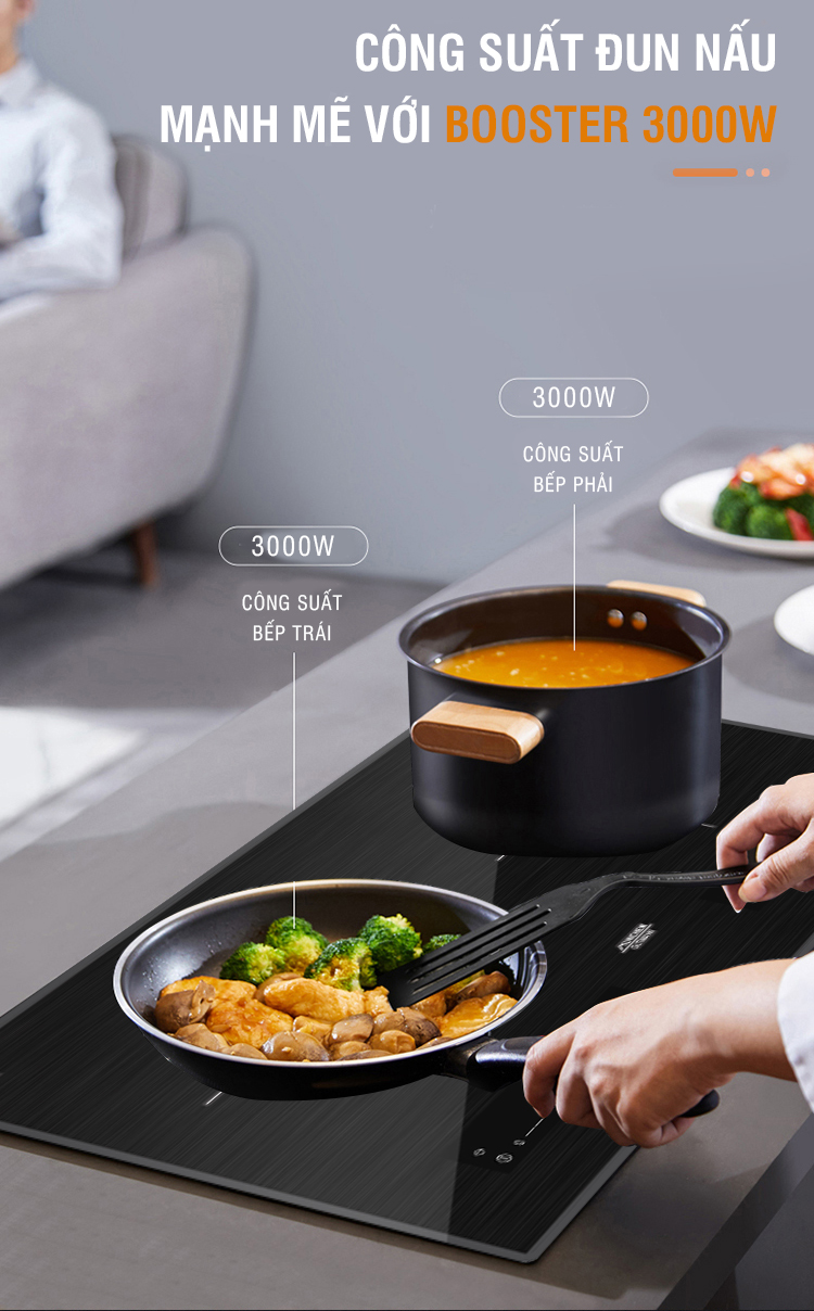 Sở hữu 2 vùng nấu có công suất mỗi vùng nấu là 2300w, nhưng lại có thể tăng tối đa 3000w với chức năng booster. Khiến thời gian đun nấu của bạn sẽ được giúp ngắn đáng kể.