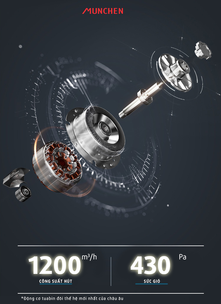 Những mẫu hút mùi kính vát Munchen được trang bị động cơ tuabin đôi thế hệ mới nhất được sản xuất tại Đức, mang đến cho máy một công suất hút cực lớn và khắc phục triệt để các yếu điểm của dòng động cơ thông thường như công suát yếu, tốn điện, độ ồn to... Các mức công suất hút cụ thể trên từng model là Munchen AM35W là 1200m3/h, Munchen AM239i là 1950m3/h, Munchen AM380 là 1200m3/h.