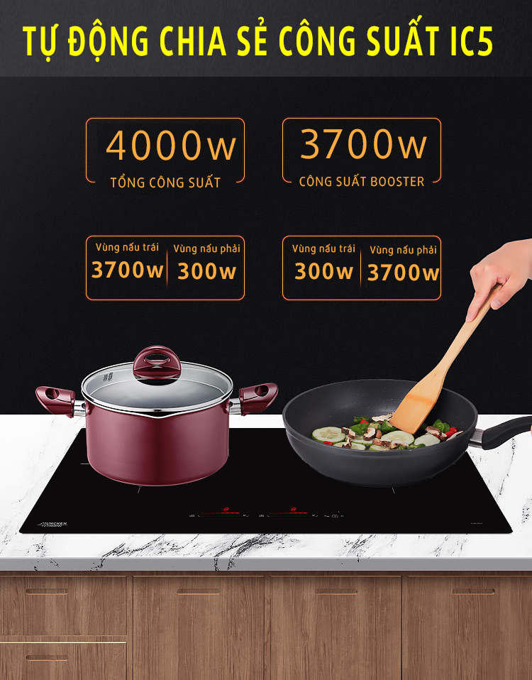 Có một sự thật đó là bạn không thế sử dụng cả 2 vùng nấu của bếp từ Munchen GM8999 ở mức công suất cao nhất 2300W hoặc 3700w ở mức booster. Vì bếp được tích hợp hệ thống tự động san công suất với tổng công suất 4000w, khi tăng công suất một vùng nấu, thì công suất vùng nấu kia sẽ tự động giảm xuống sao cho tổng công suất khi sử dụng đồng thời của cả 2 vùng nấu chỉ là 4000W.