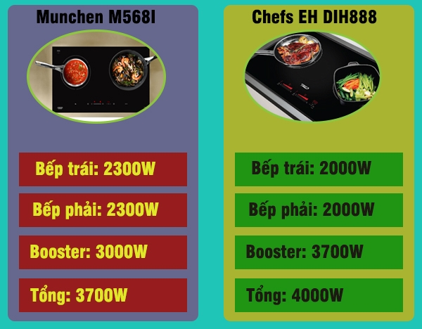 Cùng linh kiện, cùng công nghệ, cùng nhập khẩu từ Đức, nhưng khi so sánh về công suất đun nấu thì mẫu bếp từ Chefs EH DIH888 có sự khác biệt khá lớn với Munchen M568i, điều này khá dễ hiểu khi mà các bếp Munchen luôn luôn có mức độ tiết kiệm điện siêu tốt so kiểm soát mức công suất bếp.
