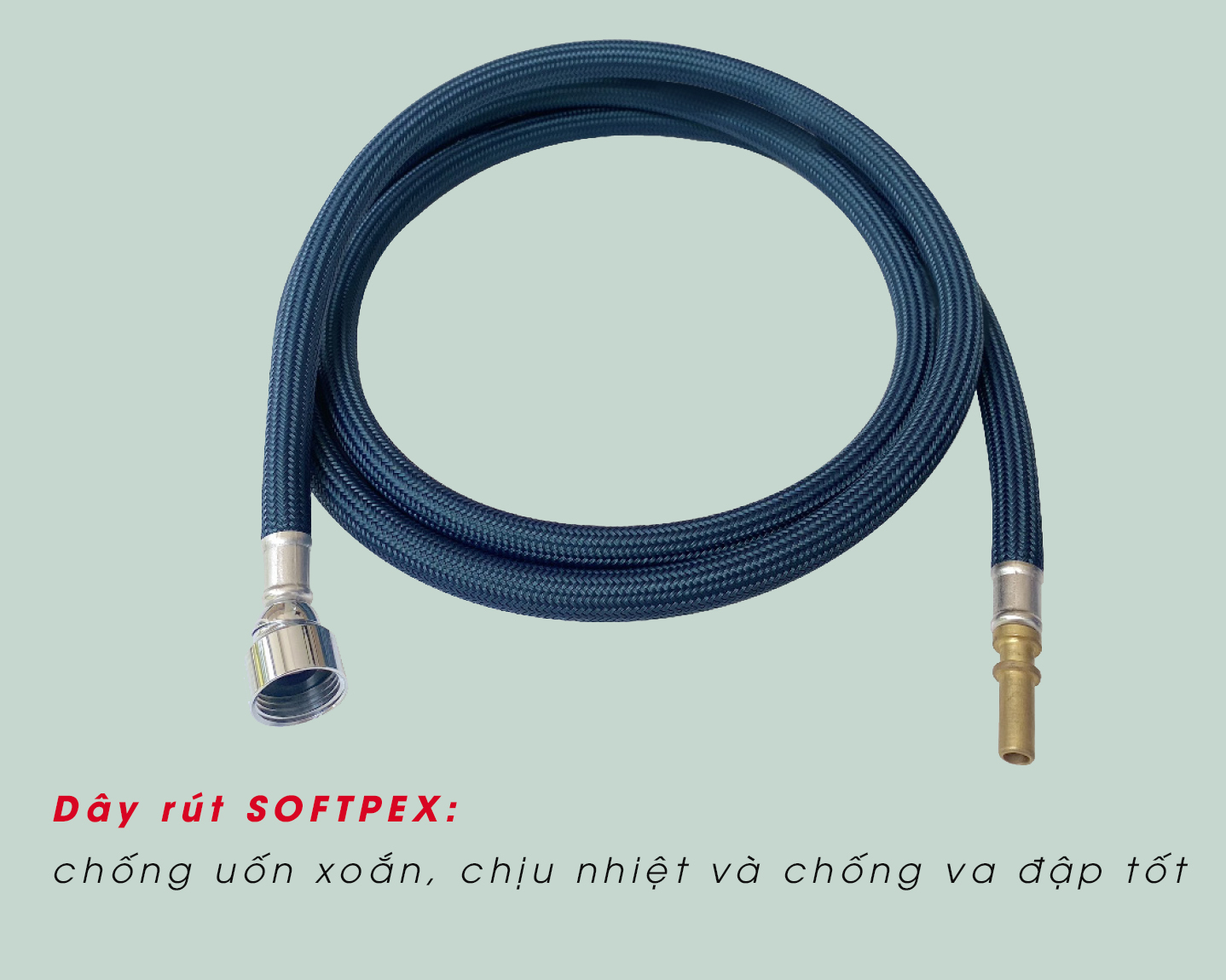 - Dây dẫn vòi rửa bát dây rút Munchen sử dụng ống SOFTPEX® thương hiệu Neoperl, với khả năng chống uốn xoắn, chịu nhiệt và chống va đập tốt. Đảm bảo tuổi thọ làm việc lên đến 10 năm.